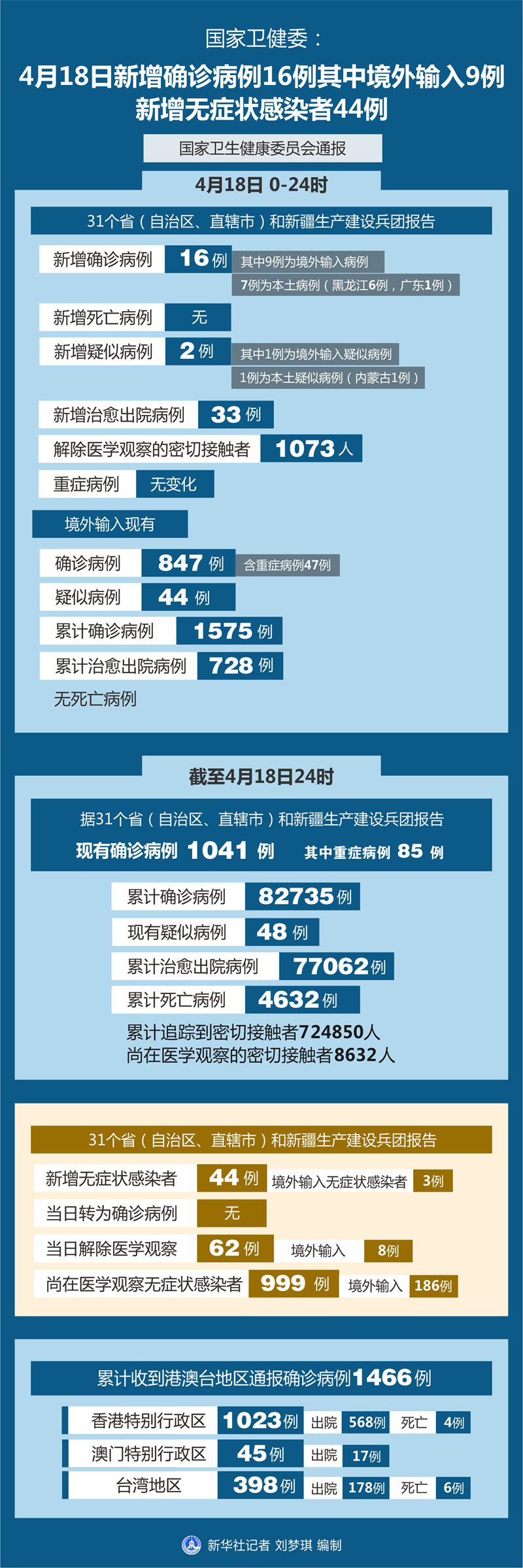 截至4月18日24時(shí),據(jù)31個(gè)?。ㄗ灾螀^(qū)、直轄市)和新疆生產(chǎn)建設(shè)兵團(tuán)報(bào)告,現(xiàn)有確診病例1041例(其中重癥病例85例),累計(jì)治愈出院病例77062例,累計(jì)死亡病例4632例,累計(jì)報(bào)告確診病例82735例,現(xiàn)有疑似病例48例。累計(jì)追蹤到密切接觸者724850人,尚在醫(yī)學(xué)觀察的密切接觸者8632人。