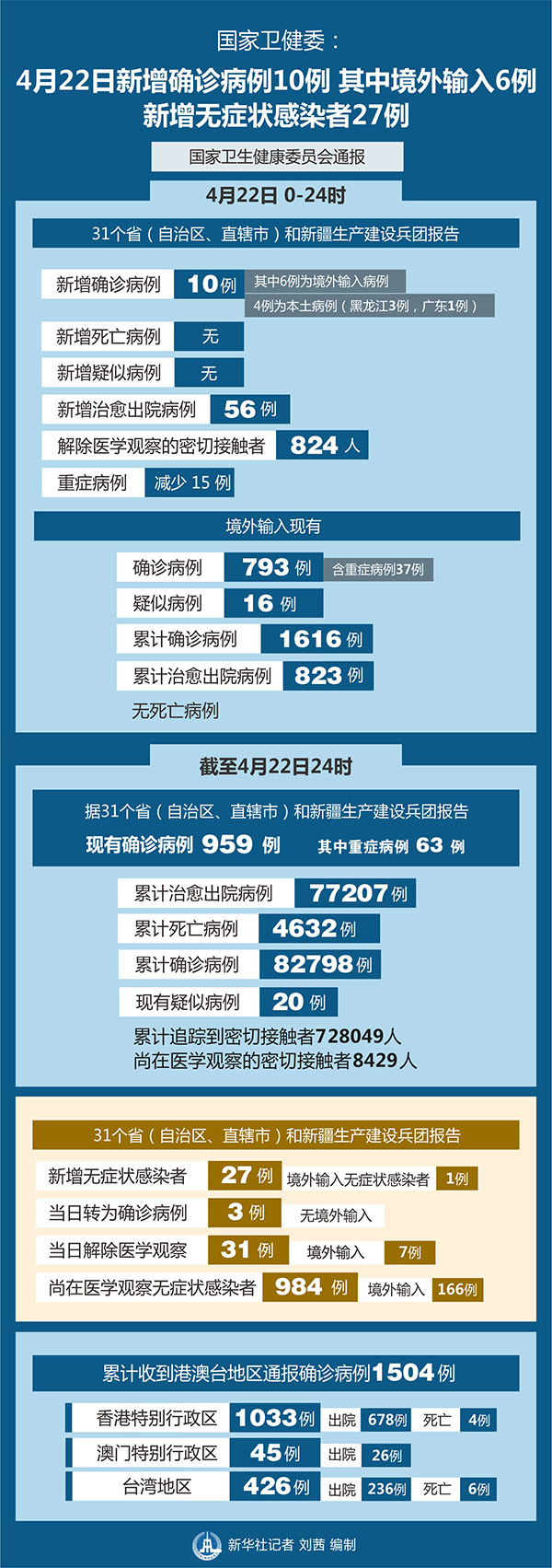 截至4月22日24時(shí),據(jù)31個(gè)?。ㄗ灾螀^(qū)、直轄市)和新疆生產(chǎn)建設(shè)兵團(tuán)報(bào)告,現(xiàn)有確診病例959例(其中重癥病例63例),累計(jì)治愈出院病例77207例,累計(jì)死亡病例4632例,累計(jì)報(bào)告確診病例82798例,現(xiàn)有疑似病例20例。累計(jì)追蹤到密切接觸者728049人,尚在醫(yī)學(xué)觀察的密切接觸者8429人。