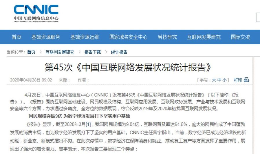 4月28日,中國互聯(lián)網(wǎng)絡(luò)信息中心(CNNIC)發(fā)布第45次《中國互聯(lián)網(wǎng)絡(luò)發(fā)展?fàn)顩r統(tǒng)計(jì)報(bào)告》(以下簡稱:《報(bào)告》)。《報(bào)告》圍繞互聯(lián)網(wǎng)基礎(chǔ)建設(shè)、網(wǎng)民規(guī)模及結(jié)構(gòu)、互聯(lián)網(wǎng)應(yīng)用發(fā)展、互聯(lián)網(wǎng)政務(wù)發(fā)展、產(chǎn)業(yè)與技術(shù)發(fā)展和互聯(lián)網(wǎng)安全等六個(gè)方面,力求通過多角度、全方位的數(shù)據(jù)展現(xiàn),綜合反映2019年及2020年初我國互聯(lián)網(wǎng)發(fā)展?fàn)顩r。