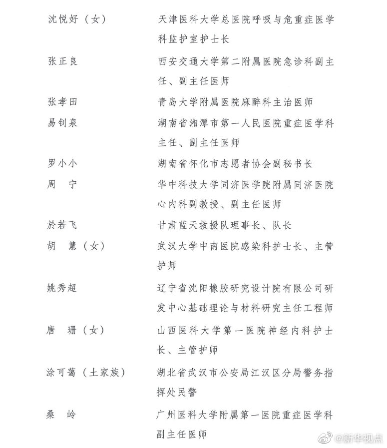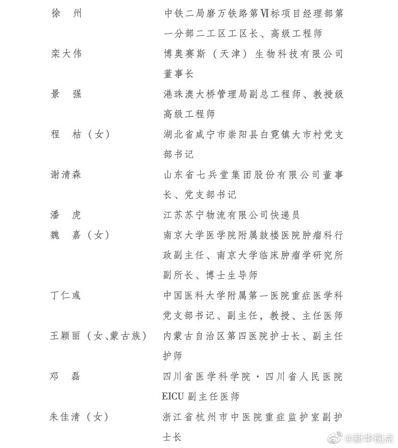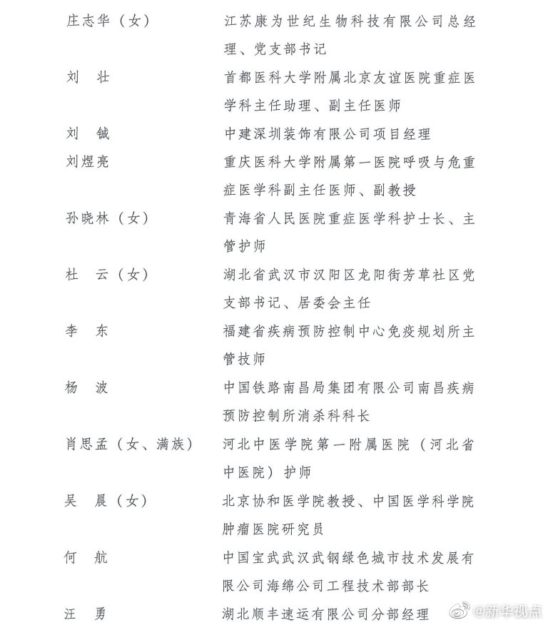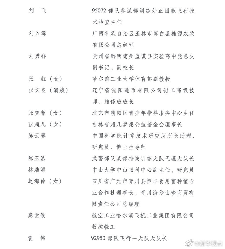 榮獲第24屆“中國(guó)青年五四獎(jiǎng)?wù)隆钡姆謩e是:江蘇省南京市鼓樓區(qū)方家營(yíng)消防救援站站長(zhǎng)助理、三級(jí)消防長(zhǎng)丁良浩,安徽省滁州市定遠(yuǎn)縣吳圩鎮(zhèn)西孔村黨總支第一書記王萌萌(女),廈門大學(xué)航空航天學(xué)院常務(wù)副院長(zhǎng)、特聘教授、博士生導(dǎo)師尤延鋮,湖北省黃岡市羅田縣希望小學(xué)校長(zhǎng)方榮(女),浙江每日互動(dòng)網(wǎng)絡(luò)科技股份有限公司董事長(zhǎng)兼總經(jīng)理、黨委書記方毅,浙江省杭州市拱墅區(qū)職業(yè)高級(jí)中學(xué)美發(fā)專業(yè)教師石丹(女),國(guó)家超級(jí)計(jì)算無(wú)錫中心副主任付昊桓,中國(guó)石油大港油田公司第二采油廠作業(yè)二區(qū)注采二組副組長(zhǎng)馮萌萌(女),寧夏回族自治區(qū)石嘴山市中醫(yī)醫(yī)院副主任醫(yī)師朱斌,中國(guó)國(guó)家女子排球隊(duì)隊(duì)員、隊(duì)長(zhǎng)朱婷(女),95072部隊(duì)參謀部訓(xùn)練處正團(tuán)職飛行技術(shù)檢查主任劉飛,廣西壯族自治區(qū)玉林市博白縣桂源農(nóng)牧有限公司總經(jīng)理劉入源,貴州省黔西南州望謨縣實(shí)驗(yàn)高中黨總支副書記、副校長(zhǎng)劉秀祥,哈爾濱工業(yè)大學(xué)體育部副教授張虹(女),遼寧省沈陽(yáng)造幣有限公司鉗工高級(jí)技師、維修班班長(zhǎng)張文良(滿族),北京市朝陽(yáng)區(qū)青少年指導(dǎo)服務(wù)中心主任張曉菲(女),吉林省超凡夢(mèng)想公益基金會(huì)理事長(zhǎng)張超凡(女),中國(guó)科學(xué)院計(jì)算技術(shù)研究所所長(zhǎng)助理、研究員、博士生導(dǎo)師陳云霽,武警部隊(duì)某部特戰(zhàn)訓(xùn)練大隊(duì)代理大隊(duì)長(zhǎng)陳玉浩,中山大學(xué)中山眼科中心副主任、研究員林浩添,四川省廣元市青川縣恒豐食用菌種植專業(yè)合作社理事長(zhǎng)、青川海伶山珍商貿(mào)有限責(zé)任公司總經(jīng)理趙海伶(女),航空工業(yè)哈爾濱飛機(jī)工業(yè)集團(tuán)有限公司數(shù)控銑工秦世俊,92950部隊(duì)飛行一大隊(duì)大隊(duì)長(zhǎng)袁偉,中鐵二局磨萬(wàn)鐵路第Ⅵ標(biāo)項(xiàng)目經(jīng)理部第一分部二工區(qū)工區(qū)長(zhǎng)、高級(jí)工程師徐州,博奧賽斯(天津)生物科技有限公司董事長(zhǎng)欒大偉,港珠澳大橋管理局副總工程師、教授級(jí)高級(jí)工程師景強(qiáng),湖北省咸寧市崇陽(yáng)縣白霓鎮(zhèn)大市村黨支部書記程桔(女),山東省七兵堂集團(tuán)股份有限公司董事長(zhǎng)、黨支部書記謝清森,江蘇蘇寧物流有限公司快遞員潘虎,南京大學(xué)醫(yī)學(xué)院附屬鼓樓醫(yī)院腫瘤科行政副主任、南京大學(xué)臨床腫瘤學(xué)研究所副所長(zhǎng)、博士生導(dǎo)師魏嘉(女),中國(guó)醫(yī)科大學(xué)附屬第一醫(yī)院重癥醫(yī)學(xué)科黨支部書記、副主任,教授、主任醫(yī)師丁仁彧,內(nèi)蒙古自治區(qū)第四醫(yī)院護(hù)士長(zhǎng)、副主任護(hù)師王穎麗(女、蒙古族),四川省醫(yī)學(xué)科學(xué)院·四川省人民醫(yī)院EICU副主任醫(yī)師鄧?yán)?,浙江省杭州市中醫(yī)院重癥監(jiān)護(hù)室副護(hù)士長(zhǎng)朱佳清(女),江蘇康為世紀(jì)生物科技有限公司總經(jīng)理、黨支部書記莊志華(女),首都醫(yī)科大學(xué)附屬北京友誼醫(yī)院重癥醫(yī)學(xué)科主任助理、副主任醫(yī)師劉壯,中建深圳裝飾有限公司項(xiàng)目經(jīng)理劉鋮,重慶醫(yī)科大學(xué)附屬第一醫(yī)院呼吸與危重癥醫(yī)學(xué)科副主任醫(yī)師、副教授劉煜亮,青海省人民醫(yī)院重癥醫(yī)學(xué)科護(hù)士長(zhǎng)、主管護(hù)師孫曉林(女),湖北省武漢市漢陽(yáng)區(qū)龍陽(yáng)街芳草社區(qū)黨支部書記、居委會(huì)主任杜云(女),福建省疾病預(yù)防控制中心免疫規(guī)劃所主管技師李東,中國(guó)鐵路南昌局集團(tuán)有限公司南昌疾病預(yù)防控制所消殺科科長(zhǎng)楊波,河北中醫(yī)學(xué)院第一附屬醫(yī)院(河北省中醫(yī)院)護(hù)師肖思孟(女、滿族),北京協(xié)和醫(yī)學(xué)院教授、中國(guó)醫(yī)學(xué)科學(xué)院腫瘤醫(yī)院研究員吳晨(女),中國(guó)寶武武漢武鋼綠色城市技術(shù)發(fā)展有限公司海綿公司工程技術(shù)部部長(zhǎng)何航,湖北順豐速運(yùn)有限公司分部經(jīng)理汪勇,天津醫(yī)科大學(xué)總醫(yī)院呼吸與危重癥醫(yī)學(xué)科監(jiān)護(hù)室護(hù)士長(zhǎng)沈悅好(女),西安交通大學(xué)第二附屬醫(yī)院急診科副主任、副主任醫(yī)師張正良,青島大學(xué)附屬醫(yī)院麻醉科主治醫(yī)師張孝田,湖南省湘潭市第一人民醫(yī)院重癥醫(yī)學(xué)科主任、副主任醫(yī)師易釗泉,湖南省懷化市志愿者協(xié)會(huì)副秘書長(zhǎng)羅小小,華中科技大學(xué)同濟(jì)醫(yī)學(xué)院附屬同濟(jì)醫(yī)院心內(nèi)科副教授、副主任醫(yī)師周寧,甘肅藍(lán)天救援隊(duì)理事長(zhǎng)、隊(duì)長(zhǎng)於若飛,武漢大學(xué)中南醫(yī)院感染科護(hù)士長(zhǎng)、主管護(hù)師胡慧(女),遼寧省沈陽(yáng)橡膠研究設(shè)計(jì)院有限公司研發(fā)中心基礎(chǔ)理論與材料研究主任工程師姚秀超,山西醫(yī)科大學(xué)第一醫(yī)院神經(jīng)內(nèi)科護(hù)士長(zhǎng)、主管護(hù)師唐珊(女),湖北省武漢市公安局江漢區(qū)分局警務(wù)指揮處民警涂可藹(土家族),廣州