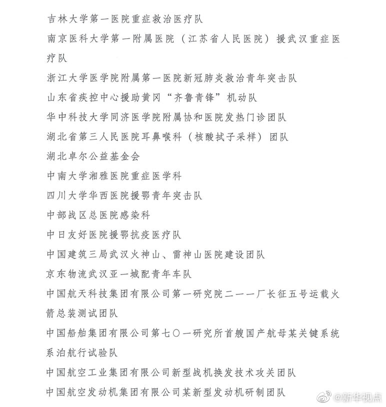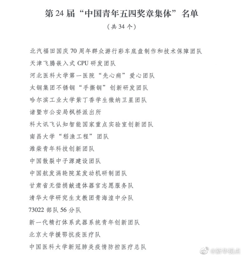 榮獲“中國(guó)青年五四獎(jiǎng)?wù)录w”的分別是:北汽福田國(guó)慶70周年群眾游行彩車底盤制作和技術(shù)保障團(tuán)隊(duì),天津飛騰嵌入式CPU研發(fā)團(tuán)隊(duì),河北醫(yī)科大學(xué)第一醫(yī)院“先心病”愛心團(tuán)隊(duì),太鋼集團(tuán)不銹鋼“手撕鋼”創(chuàng)新研發(fā)團(tuán)隊(duì),哈爾濱工業(yè)大學(xué)紫丁香學(xué)生微納衛(wèi)星團(tuán)隊(duì),諸暨市公安局楓橋派出所,科大訊飛認(rèn)知智能國(guó)家重點(diǎn)實(shí)驗(yàn)室創(chuàng)新團(tuán)隊(duì),南昌大學(xué)“稻漁工程”團(tuán)隊(duì),濰柴青年科技創(chuàng)新團(tuán)隊(duì),中國(guó)散裂中子源建設(shè)團(tuán)隊(duì),中國(guó)航發(fā)渦輪院某發(fā)動(dòng)機(jī)研制團(tuán)隊(duì),甘肅省無(wú)償捐獻(xiàn)遺體器官志愿服務(wù)隊(duì),清華大學(xué)研究生支教團(tuán)青海湟中分隊(duì),73022部隊(duì)56分隊(duì),新一代精打體系武器系統(tǒng)青年創(chuàng)新團(tuán)隊(duì),北京大學(xué)援鄂抗疫醫(yī)療隊(duì),中國(guó)醫(yī)科大學(xué)新冠肺炎疫情防控醫(yī)療總隊(duì),吉林大學(xué)第一醫(yī)院重癥救治醫(yī)療隊(duì),南京醫(yī)科大學(xué)第一附屬醫(yī)院(江蘇省人民醫(yī)院)援武漢重癥醫(yī)療隊(duì),浙江大學(xué)醫(yī)學(xué)院附屬第一醫(yī)院新冠肺炎救治青年突擊隊(duì),山東省疾控中心援助黃岡“齊魯青鋒”機(jī)動(dòng)隊(duì),華中科技大學(xué)同濟(jì)醫(yī)學(xué)院附屬協(xié)和醫(yī)院發(fā)熱門診團(tuán)隊(duì),湖北省第三人民醫(yī)院耳鼻喉科(核酸拭子采樣)團(tuán)隊(duì),湖北卓爾公益基金會(huì),中南大學(xué)湘雅醫(yī)院重癥醫(yī)學(xué)科,四川大學(xué)華西醫(yī)院援鄂青年突擊隊(duì),中部戰(zhàn)區(qū)總醫(yī)院感染科,中日友好醫(yī)院援鄂抗疫醫(yī)療隊(duì),中國(guó)建筑三局武漢火神山、雷神山醫(yī)院建設(shè)團(tuán)隊(duì),京東物流武漢亞一城配青年車隊(duì),中國(guó)航天科技集團(tuán)有限公司第一研究院二一一廠長(zhǎng)征五號(hào)運(yùn)載火箭總裝測(cè)試團(tuán)隊(duì),中國(guó)船舶集團(tuán)有限公司第七〇一研究所首艘國(guó)產(chǎn)航母某關(guān)鍵系統(tǒng)系泊航行試驗(yàn)隊(duì),中國(guó)航空工業(yè)集團(tuán)有限公司新型戰(zhàn)機(jī)換發(fā)技術(shù)攻關(guān)團(tuán)隊(duì),中國(guó)航空發(fā)動(dòng)機(jī)集團(tuán)有限公司某新型發(fā)動(dòng)機(jī)研制團(tuán)隊(duì)。