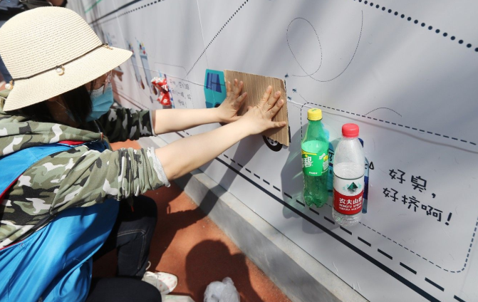 4月28日,“家園衛(wèi)士 分類先行”垃圾分類主題活動(dòng)在東城區(qū)建國(guó)門街道舉行,社區(qū)工作人員和居民將消毒的瓶蓋、易拉罐等生活垃圾粘貼在墻面上的相應(yīng)位置。攝影/新京報(bào)記者 王貴彬