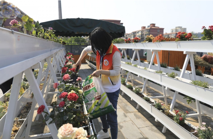 4月27日,海淀區(qū)學(xué)院路街道二里莊社區(qū),“廚余垃圾資源化一體機(jī)”轉(zhuǎn)化出來的營(yíng)養(yǎng)土經(jīng)過晾曬后,用于屋頂花園的花草種植。攝影/新京報(bào)記者 浦峰