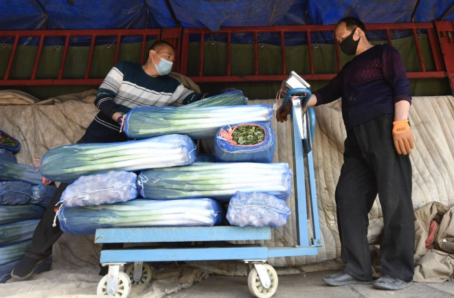 4月13日,新發(fā)地市場(chǎng),批發(fā)商正在對(duì)來自上海的凈蔥進(jìn)行過秤。為實(shí)現(xiàn)垃圾減量,新發(fā)地鼓勵(lì)商戶“凈菜進(jìn)京”,大蔥、洋蔥等“主菜”在產(chǎn)地裝車時(shí),就去掉了多余部分。