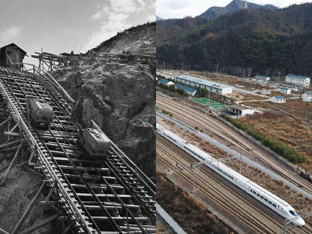 (左圖:1957年金寨響洪甸水庫工地上吊車運(yùn)送混凝土,新華社稿王永嘉攝;右圖:2019年高鐵駛出金寨火車站。新華社記者張端攝)