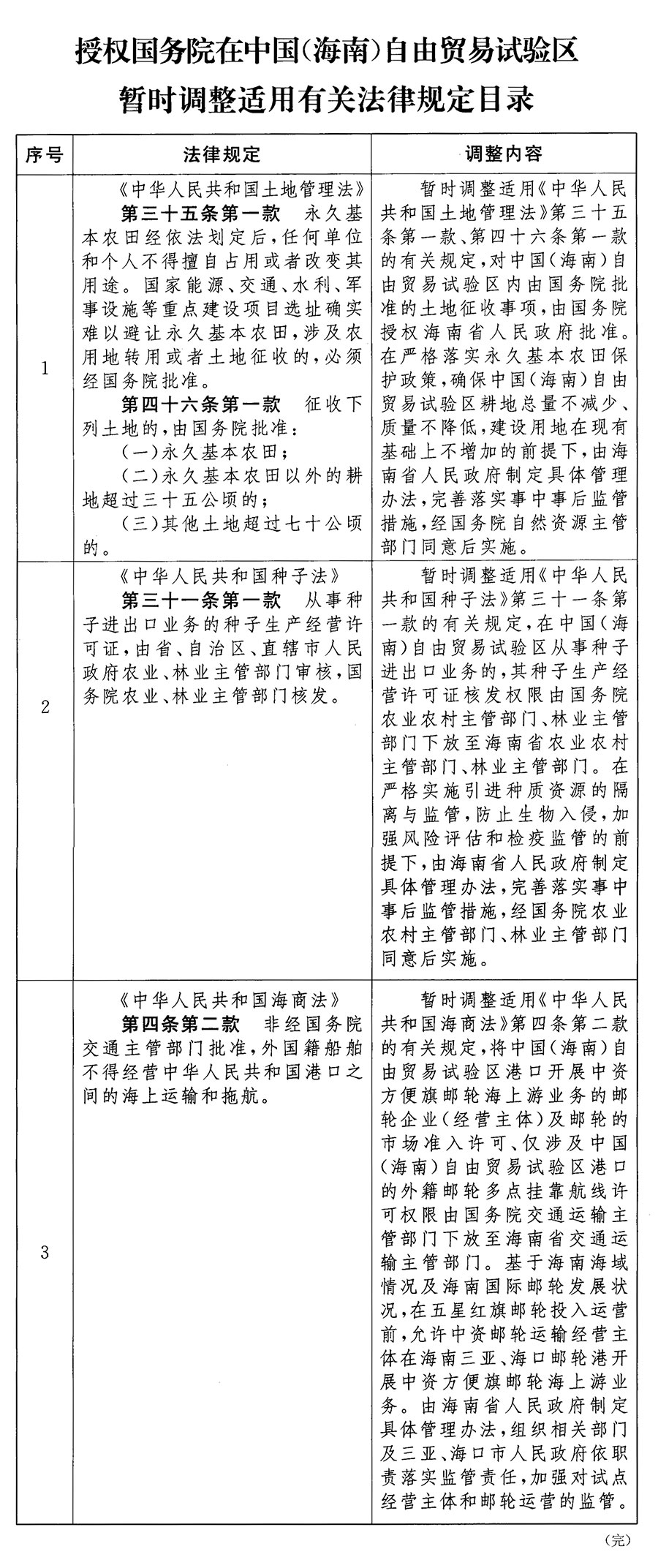 為支持海南全面深化改革開(kāi)放,推動(dòng)中國(guó)(海南)自由貿(mào)易試驗(yàn)區(qū)試點(diǎn)政策落地,第十三屆全國(guó)人民代表大會(huì)常務(wù)委員會(huì)第十七次會(huì)議決定:授權(quán)國(guó)務(wù)院在中國(guó)(海南)自由貿(mào)易試驗(yàn)區(qū)暫時(shí)調(diào)整適用《中華人民共和國(guó)土地管理法》《中華人民共和國(guó)種子法》《中華人民共和國(guó)海商法》的有關(guān)規(guī)定(目錄附后),暫時(shí)調(diào)整適用的期限至2024年12月31日。暫時(shí)調(diào)整適用有關(guān)法律規(guī)定,必須建立健全事中事后監(jiān)管制度,有效防控風(fēng)險(xiǎn),國(guó)務(wù)院及其有關(guān)部門要加強(qiáng)指導(dǎo)、協(xié)調(diào)和監(jiān)督,及時(shí)總結(jié)試點(diǎn)工作經(jīng)驗(yàn),并就暫時(shí)調(diào)整適用有關(guān)法律規(guī)定的情況向全國(guó)人民代表大會(huì)常務(wù)委員會(huì)作出中期報(bào)告。對(duì)實(shí)踐證明可行的,修改完善有關(guān)法律;對(duì)實(shí)踐證明不宜調(diào)整的,恢復(fù)施行有關(guān)法律規(guī)定。