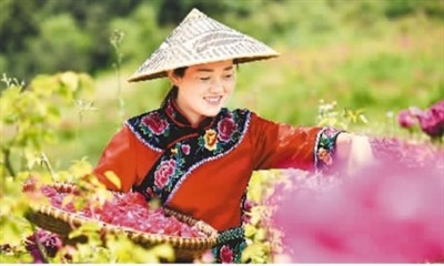 5月3日,村民在貴州省銅仁市松桃苗族自治縣黃板鎮(zhèn)臘沖村玫瑰產(chǎn)業(yè)園采收玫瑰花。 龍元彬攝