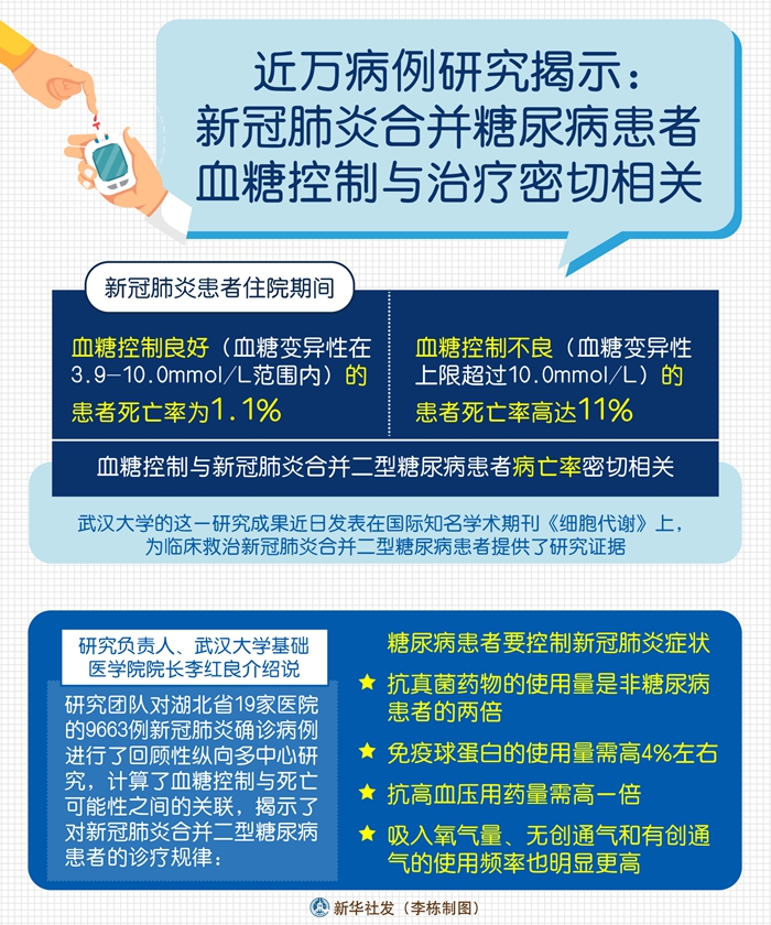 研究負責(zé)人、武漢大學(xué)基礎(chǔ)醫(yī)學(xué)院院長李紅良介紹說,研究團隊對湖北省19家醫(yī)院的9663例新冠肺炎確診病例進行了回顧性縱向多中心研究,計算了血糖控制與死亡可能性之間的關(guān)聯(lián),揭示了對新冠肺炎合并二型糖尿病患者的診療規(guī)律:糖尿病患者要控制新冠肺炎癥狀,抗真菌藥物的使用量是非糖尿病患者的兩倍,免疫球蛋白的使用量需高4%左右,抗高血壓用藥量需高一倍,吸入氧氣量、無創(chuàng)通氣和有創(chuàng)通氣的使用頻率也明顯更高。