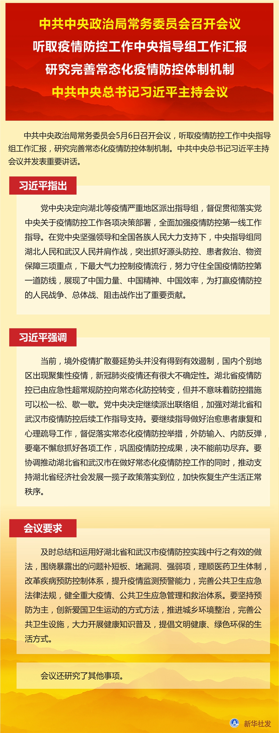 新華社北京5月6日電 中共中央政治局常務(wù)委員會(huì)5月6日召開會(huì)議,聽取疫情防控工作中央指導(dǎo)組工作匯報(bào),研究完善常態(tài)化疫情防控體制機(jī)制。中共中央總書記習(xí)近平主持會(huì)議并發(fā)表重要講話。