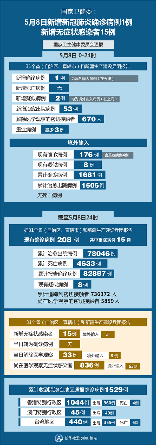 截至5月8日24時,據(jù)31個?。ㄗ灾螀^(qū)、直轄市)和新疆生產(chǎn)建設(shè)兵團報告,現(xiàn)有確診病例208例(其中重癥病例15例),累計治愈出院病例78046例,累計死亡病例4633例,累計報告確診病例82887例,現(xiàn)有疑似病例8例。累計追蹤到密切接觸者736372人,尚在醫(yī)學(xué)觀察的密切接觸者5859人。