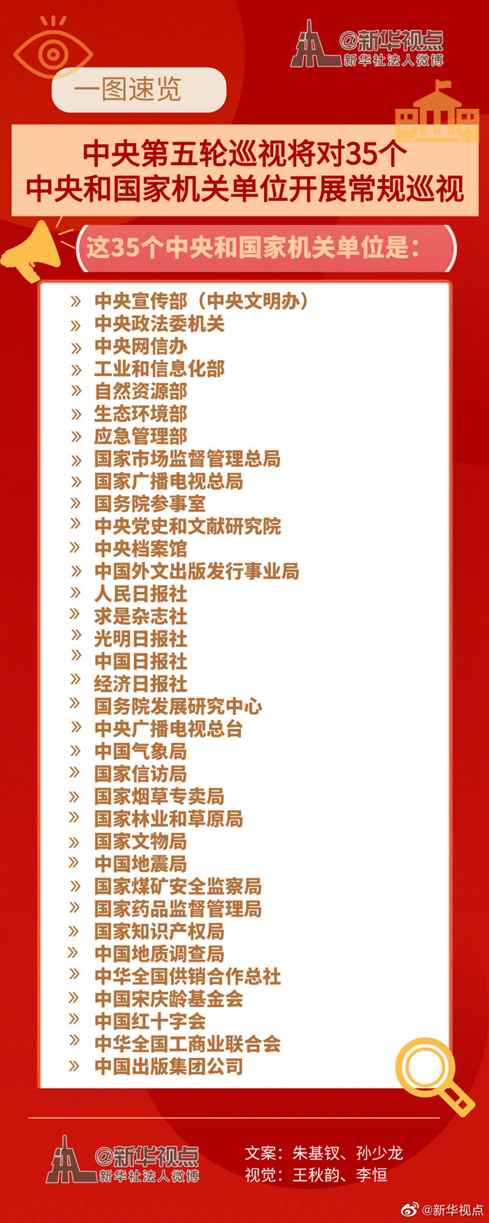 新華社北京5月9日電 經(jīng)黨中央批準(zhǔn),十九屆中央第五輪巡視將對(duì)中央宣傳部(中央文明辦)、中央政法委機(jī)關(guān)、中央網(wǎng)信辦、工業(yè)和信息化部、自然資源部、生態(tài)環(huán)境部、應(yīng)急管理部、國家市場監(jiān)督管理總局、國家廣播電視總局、國務(wù)院參事室、中央黨史和文獻(xiàn)研究院、中央檔案館、中國外文出版發(fā)行事業(yè)局、人民日?qǐng)?bào)社、求是雜志社、光明日?qǐng)?bào)社、中國日?qǐng)?bào)社、經(jīng)濟(jì)日?qǐng)?bào)社、國務(wù)院發(fā)展研究中心、中央廣播電視總臺(tái)、中國氣象局、國家信訪局、國家煙草專賣局、國家林業(yè)和草原局、國家文物局、中國地震局、國家煤礦安全監(jiān)察局、國家藥品監(jiān)督管理局、國家知識(shí)產(chǎn)權(quán)局、中國地質(zhì)調(diào)查局、中華全國供銷合作總社、中國宋慶齡基金會(huì)、中國紅十字會(huì)、中華全國工商業(yè)聯(lián)合會(huì)、中國出版集團(tuán)公司等35個(gè)中央和國家機(jī)關(guān)單位黨組織開展常規(guī)巡視。