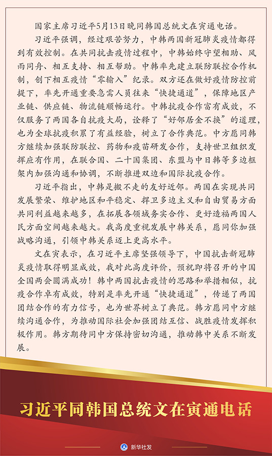 新華社北京5月13日電 國家主席習近平5月13日晚同韓國總統(tǒng)文在寅通電話。