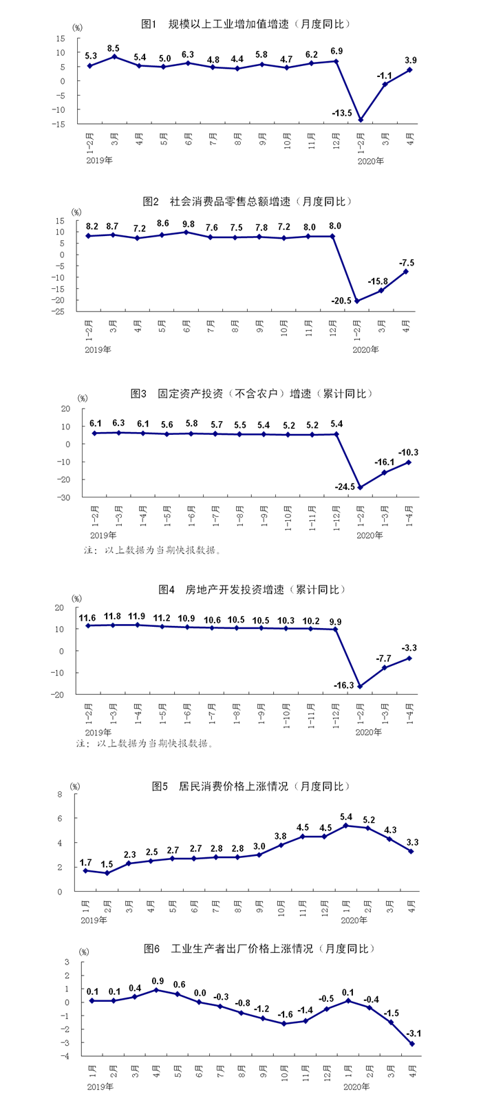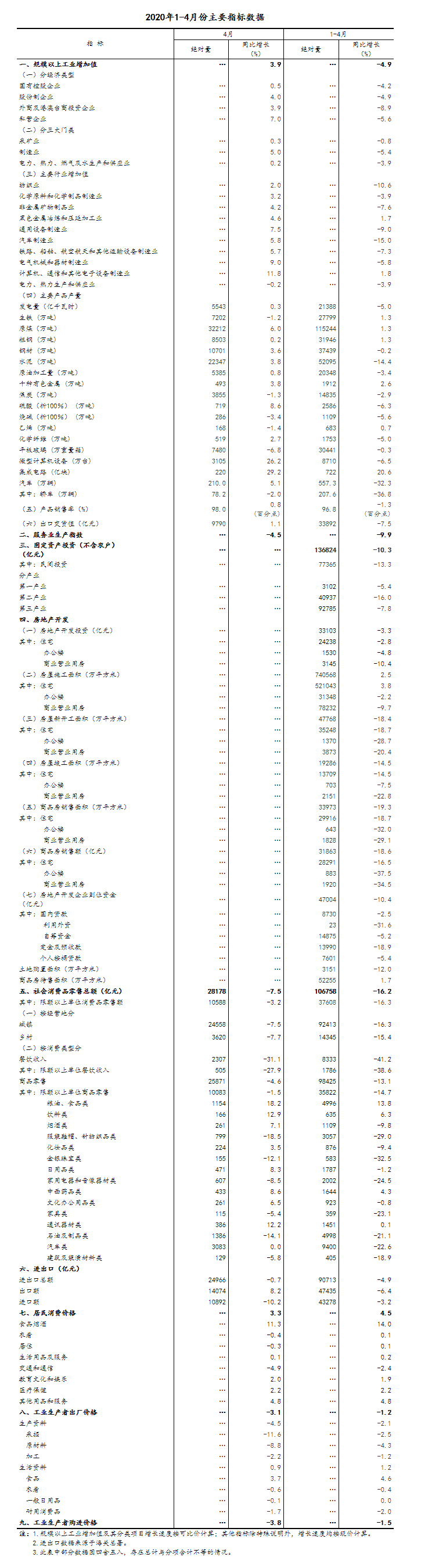 4月份,全國規(guī)模以上工業(yè)增加值同比增長3.9%,3月份為下降1.1%;環(huán)比增長2.27%。1-4月份,全國規(guī)模以上工業(yè)增加值同比下降4.9%,降幅比1-3月份收窄3.5個百分點(diǎn)。4月份,分經(jīng)濟(jì)類型看,國有控股企業(yè)增加值增長0.5%;股份制企業(yè)增長4.0%,外商及港澳臺商投資企業(yè)增長3.9%;私營企業(yè)增長7.0%。分三大門類看,采礦業(yè)增加值增長0.3%;制造業(yè)增長5.0%,3月份為下降1.8%;電力、熱力、燃?xì)饧八a(chǎn)和供應(yīng)業(yè)增長0.2%。高技術(shù)制造業(yè)和裝備制造業(yè)增長較快。4月份,高技術(shù)制造業(yè)和裝備制造業(yè)增加值分別增長10.5%和9.3%,快于規(guī)模以上工業(yè)6.6和5.4個百分點(diǎn)。從產(chǎn)品產(chǎn)量看,光纜,挖掘、鏟土運(yùn)輸機(jī)械,集成電路,工業(yè)機(jī)器人,微型計(jì)算機(jī)設(shè)備產(chǎn)量同比分別增長43.8%、40.8%、29.2%、26.6%、26.2%。