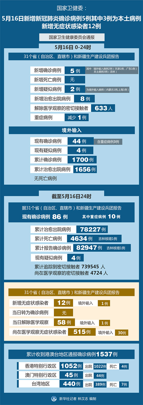 截至5月16日24時,據(jù)31個省(自治區(qū)、直轄市)和新疆生產(chǎn)建設(shè)兵團(tuán)報告,現(xiàn)有確診病例86例(其中重癥病例10例),累計治愈出院病例78227例,累計死亡病例4634例(吉林核增1例),累計報告確診病例82947例(吉林核增1例),現(xiàn)有疑似病例4例。累計追蹤到密切接觸者739545人,尚在醫(yī)學(xué)觀察的密切接觸者4724人。
