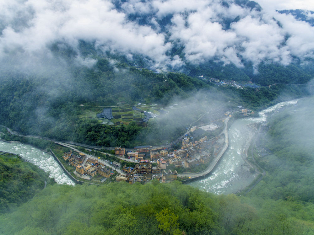 云霧繚繞的云南貢山獨(dú)龍族怒族自治縣獨(dú)龍江鄉(xiāng)(2019年4月16日無(wú)人機(jī)拍攝)。新華社記者 江文耀 攝