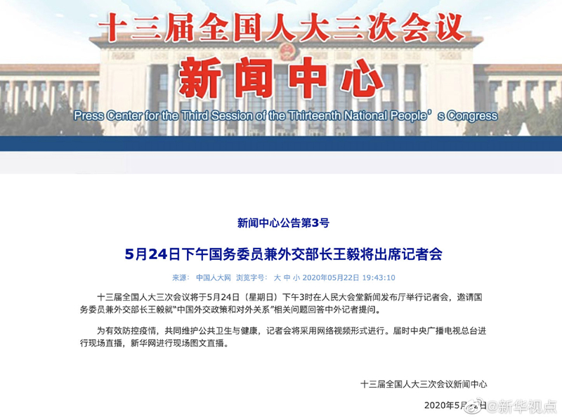 十三屆全國人大三次會議將于5月24日(星期日)下午3時(shí)在人民大會堂新聞發(fā)布廳舉行記者會,邀請國務(wù)委員兼外交部長王毅就“中國外交政策和對外關(guān)系”相關(guān)問題回答中外記者提問。