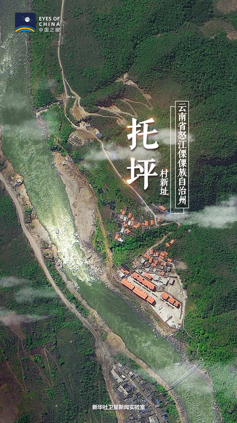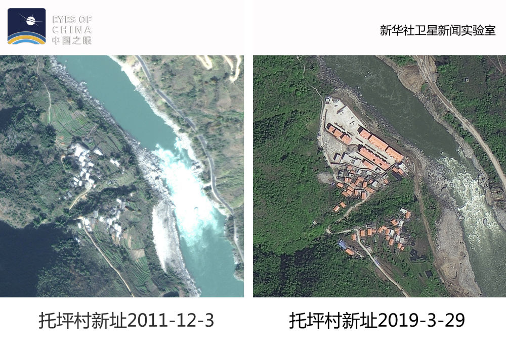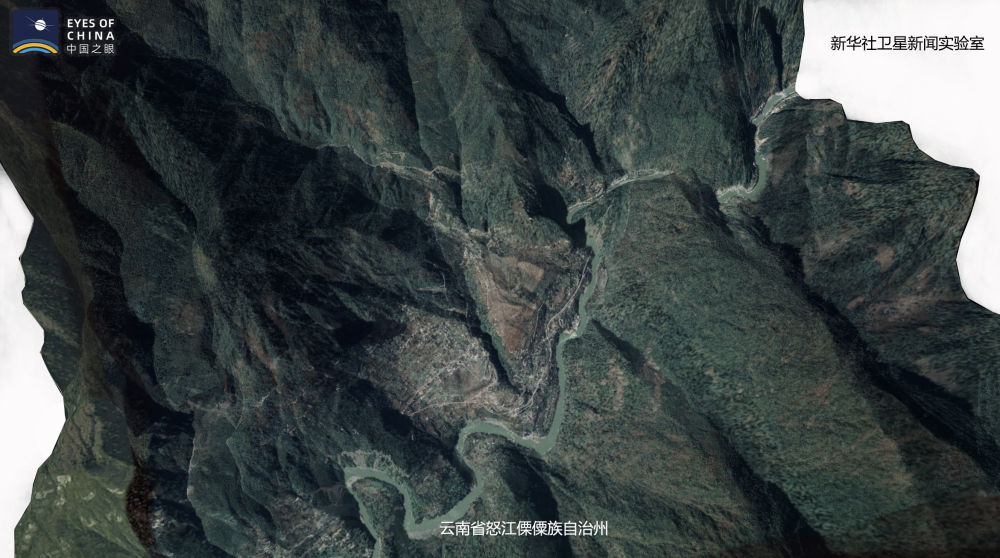 ↑從衛(wèi)星可以看到,綠樹環(huán)繞的托坪村新址位于在怒江邊上。