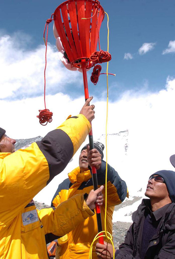 2005年5月19日,珠峰高程測(cè)量登山隊(duì)員再次在海拔6500米的前進(jìn)營地學(xué)習(xí)測(cè)量儀器的安裝固定方法。新華社記者索朗羅布攝