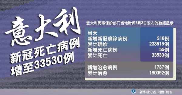 新華社羅馬6月2日電(記者陳占杰)意大利民事保護(hù)部門2日發(fā)布的數(shù)據(jù)顯示,該國當(dāng)天新增新冠確診病例318例,累計(jì)確診233515例;新增死亡病例55例,累計(jì)死亡33530例。