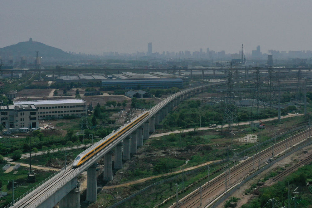 4月22日,在商合杭高鐵合肥至湖州段,聯(lián)調(diào)聯(lián)試綜合檢測(cè)列車經(jīng)過浙江湖州境內(nèi)(無人機(jī)照片)。新華社記者 黃宗治 攝