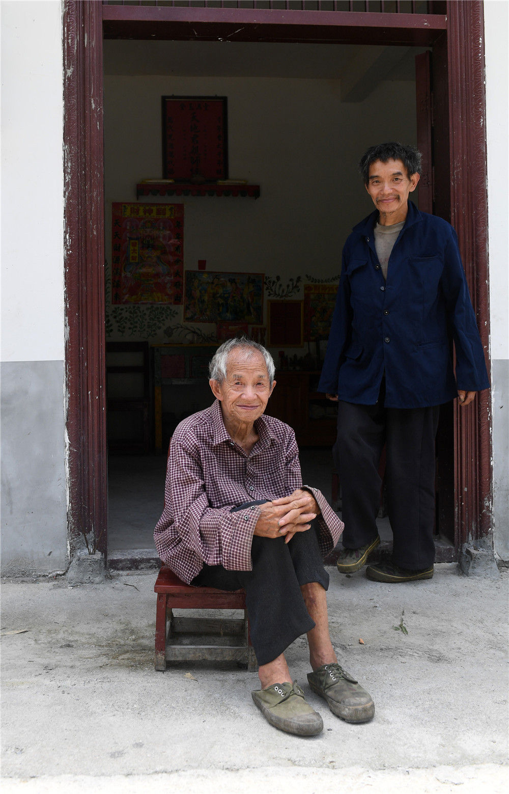 在廣西環(huán)江毛南族自治縣下南鄉(xiāng)下塘村上眉屯,譚廣田(右)和父親譚運日在家門口(5月23日攝)。新華社記者 陸波岸 攝