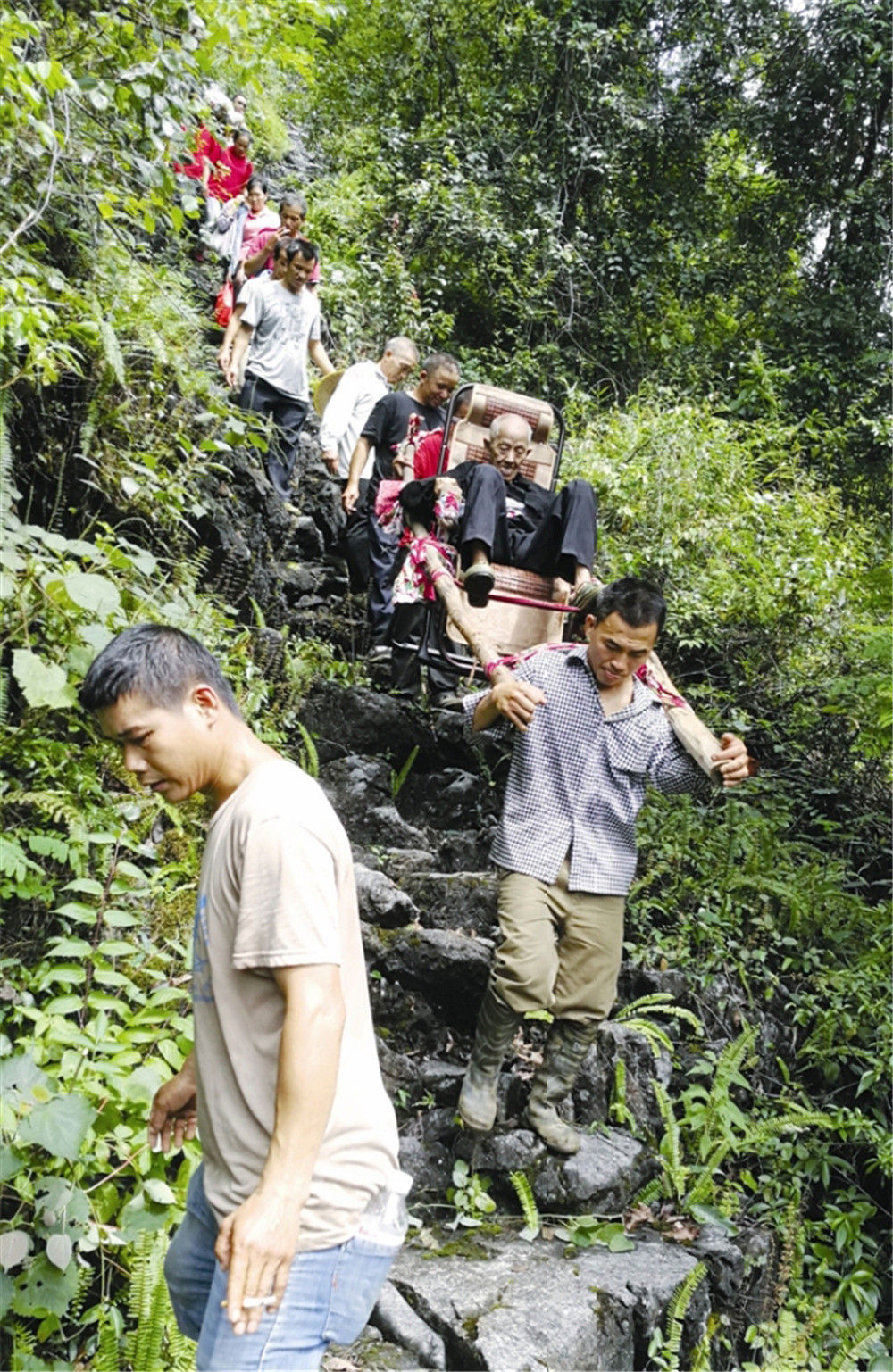 在廣西環(huán)江毛南族自治縣下南鄉(xiāng)下塘村,當(dāng)?shù)馗刹咳罕妼⒆T運日老人抬下山(2019年9月11日攝)。新華社發(fā)(譚召關(guān) 攝)