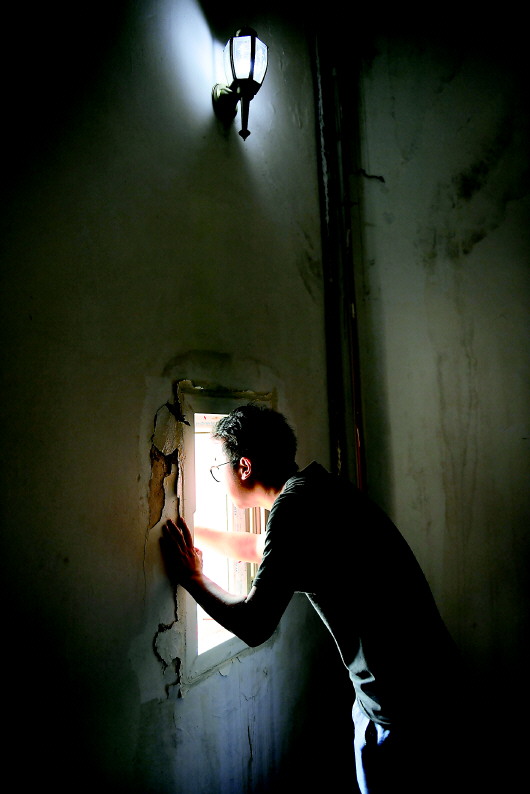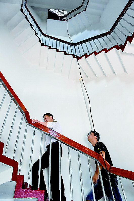 葉超群在燈塔內(nèi)向外眺望。