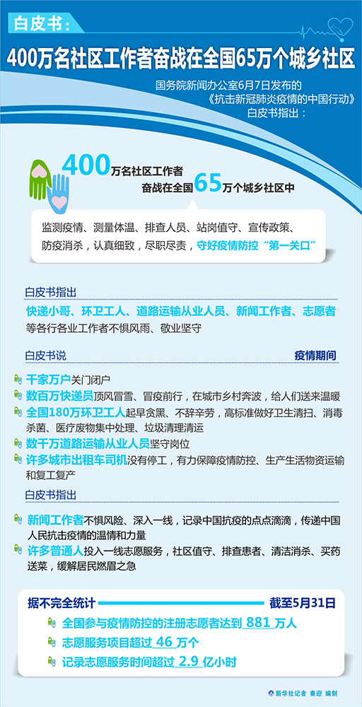 新華社北京6月7日電(記者王琳琳)國務(wù)院新聞辦公室7日發(fā)布的《抗擊新冠肺炎疫情的中國行動》白皮書指出,400萬名社區(qū)工作者奮戰(zhàn)在全國65萬個城鄉(xiāng)社區(qū)中,監(jiān)測疫情、測量體溫、排查人員、站崗值守、宣傳政策、防疫消殺,認真細致,盡職盡責,守好疫情防控“第一關(guān)口”。