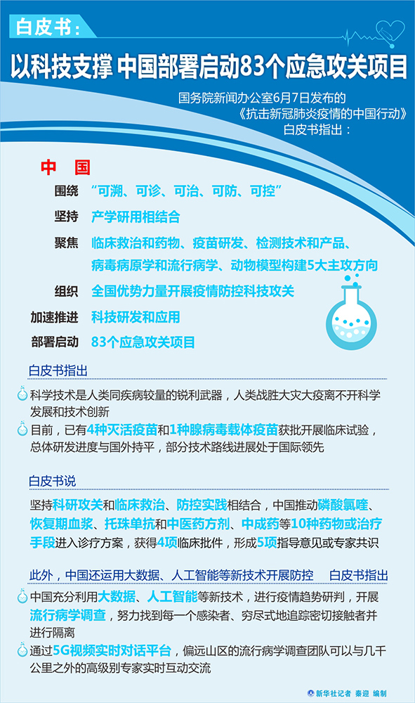 新華社北京6月7日電(記者胡喆)國務(wù)院新聞辦公室7日發(fā)布的《抗擊新冠肺炎疫情的中國行動》白皮書指出,中國圍繞“可溯、可診、可治、可防、可控”,堅持產(chǎn)學研用相結(jié)合,聚焦臨床救治和藥物、疫苗研發(fā)、檢測技術(shù)和產(chǎn)品、病毒病原學和流行病學、動物模型構(gòu)建5大主攻方向,組織全國優(yōu)勢力量開展疫情防控科技攻關(guān),加速推進科技研發(fā)和應(yīng)用,部署啟動83個應(yīng)急攻關(guān)項目。