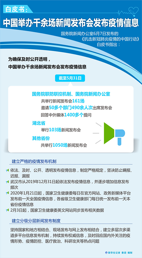 截至5月31日,國(guó)務(wù)院聯(lián)防聯(lián)控機(jī)制、國(guó)務(wù)院新聞辦公室共舉行新聞發(fā)布會(huì)161場(chǎng),邀請(qǐng)50多個(gè)部門490余人次出席發(fā)布會(huì),回答中外媒體1400多個(gè)提問(wèn);湖北省舉行103場(chǎng)新聞發(fā)布會(huì),其他省份共舉行1050場(chǎng)新聞發(fā)布會(huì)。