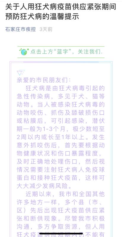 6月6日,石家莊市疾控中心發(fā)布了公告稱狂犬疫苗供應(yīng)緊張。截圖