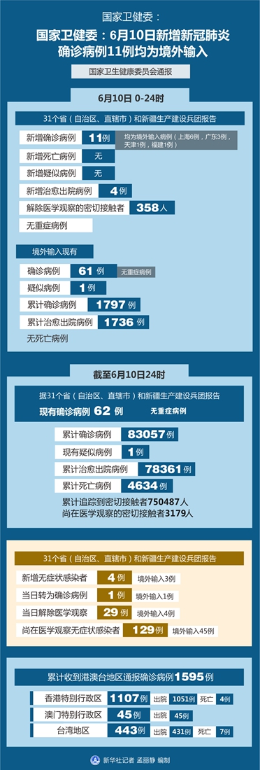 新華社北京6月11日電(記者陳聰)據(jù)國家衛(wèi)生健康委員會11日通報,6月10日0-24時,31個?。ㄗ灾螀^(qū)、直轄市)和新疆生產(chǎn)建設(shè)兵團報告新增新冠肺炎確診病例11例,均為境外輸入病例(上海6例,廣東3例,天津1例,福建1例);無新增死亡病例;無新增疑似病例。