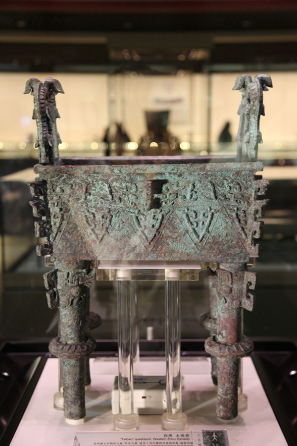 “從形制大小來看,有別于三足圓鼎,這件四足方鼎應(yīng)該是西周早期貴族所用的器物。方鼎高50.7厘米、口徑23.36厘米、重26公斤。方鼎的腹部?jī)?nèi)壁上清晰地鑄有‘大保鑄’三字銘文。據(jù)考證,這‘大?!制鋵?shí)應(yīng)該為‘太保’,因此這件方鼎被稱作太保鼎?!标愖空f。