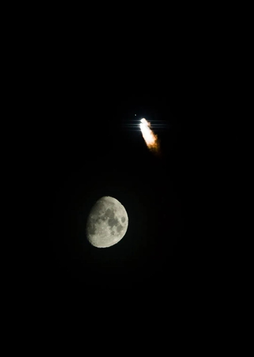 2015年3月30日,搭載首顆新一代北斗導(dǎo)航衛(wèi)星的長征三號丙運載火箭在西昌衛(wèi)星發(fā)射中心點火發(fā)射,火箭升空后與明月交相輝映。新華社記者 白禹 攝