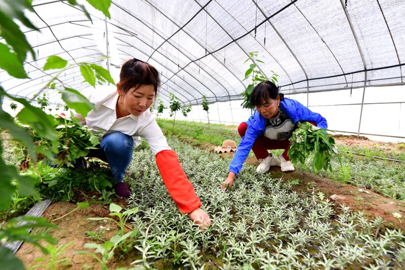 山西省呂梁市嵐縣王獅鄉(xiāng)蛤蟆神村的村民在造林合作社為沙棘苗除草(6月9日攝)。新華社記者 曹陽 攝