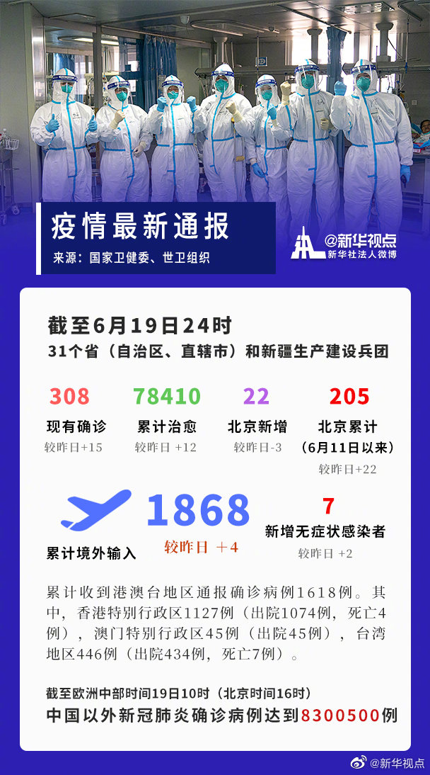 截至6月19日24時,據(jù)31個?。ㄗ灾螀^(qū)、直轄市)和新疆生產建設兵團報告,現(xiàn)有確診病例308例(其中重癥病例13例),累計治愈出院病例78410例,累計死亡病例4634例,累計報告確診病例83352例,現(xiàn)有疑似病例11例。累計追蹤到密切接觸者756223人,尚在醫(yī)學觀察的密切接觸者6023人。