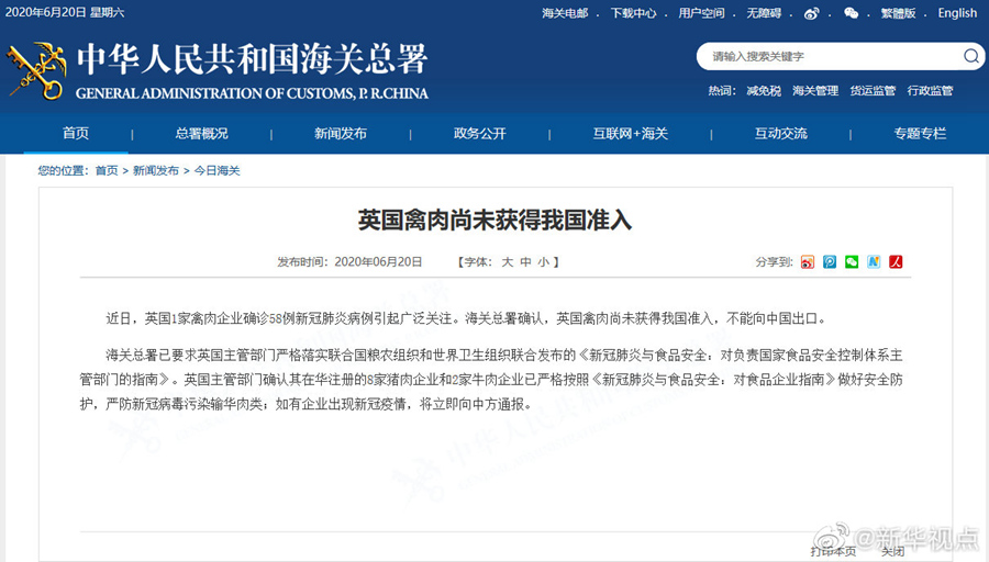 海關(guān)總署20日發(fā)布公告說,近日英國一家禽肉企業(yè)確診58例新冠肺炎病例引起廣泛關(guān)注。海關(guān)總署確認(rèn),英國禽肉尚未獲得我國準(zhǔn)入,不能向中國出口。海關(guān)總署已要求英國主管部門嚴(yán)格落實(shí)聯(lián)合國糧農(nóng)組織和世界衛(wèi)生組織聯(lián)合發(fā)布的《新冠肺炎與食品安全:對負(fù)責(zé)國家食品安全控制體系主管部門的指南》。英國主管部門確認(rèn)其在華注冊的8家豬肉企業(yè)和2家牛肉企業(yè)已嚴(yán)格按照《新冠肺炎與食品安全:對食品企業(yè)指南》做好安全防護(hù),嚴(yán)防新冠病毒污染輸華肉類;如有企業(yè)出現(xiàn)新冠疫情,將立即向中方通報(bào)。(記者劉紅霞)