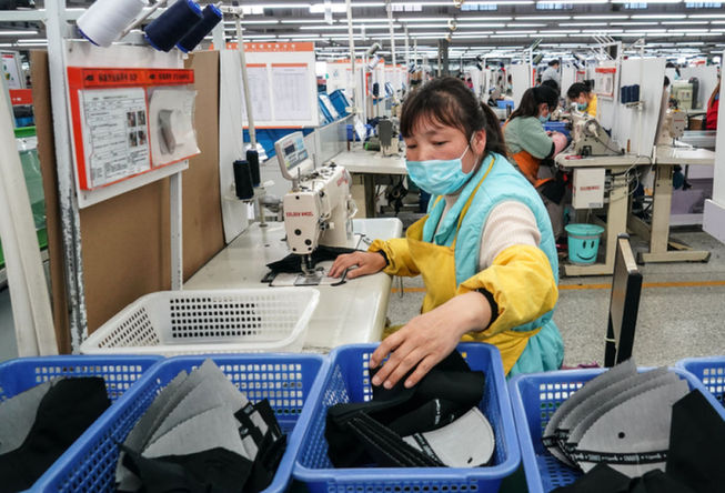 淮安源通制帽有限公司扶貧車間內(nèi),工人在生產(chǎn)帽子 楊磊 攝