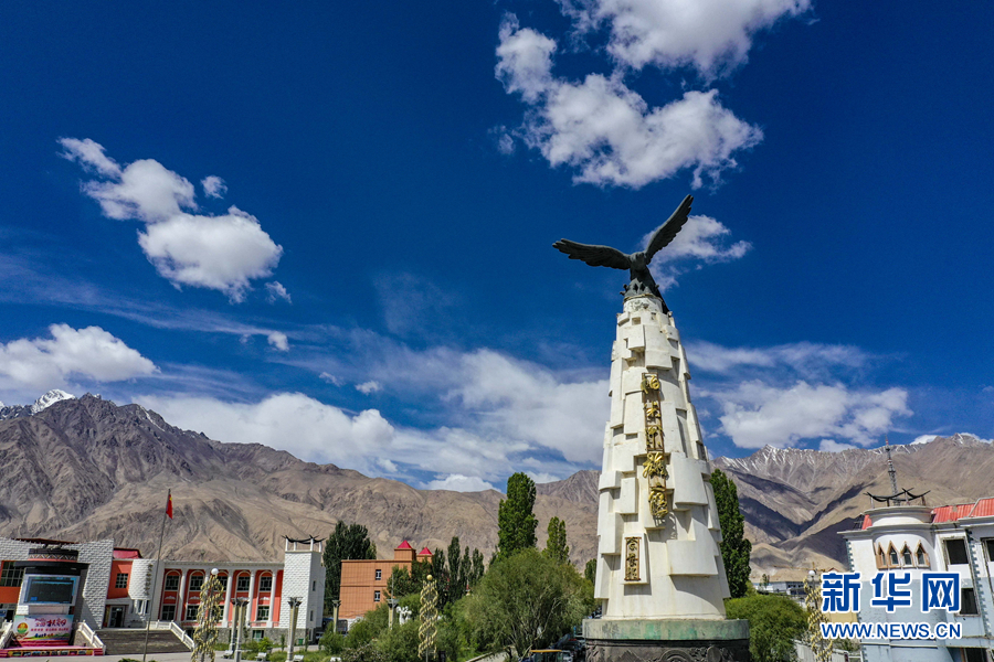 這是位于新疆塔什庫(kù)爾干塔吉克自治縣縣城的“帕米爾雄鷹”雕塑(6月20日攝,無(wú)人機(jī)照片)。新華社記者 胡虎虎 攝
