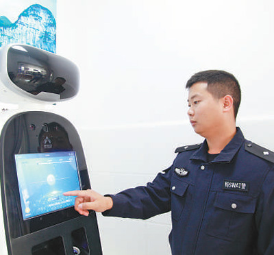 織金縣珠藏鎮(zhèn)警務(wù)助理肖發(fā)陽在展示智能機(jī)器人如何使用。黃 嫻攝