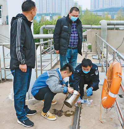 濟(jì)南的禁毒民警、禁毒社工在現(xiàn)場采集污水樣品。賈衛(wèi)國攝