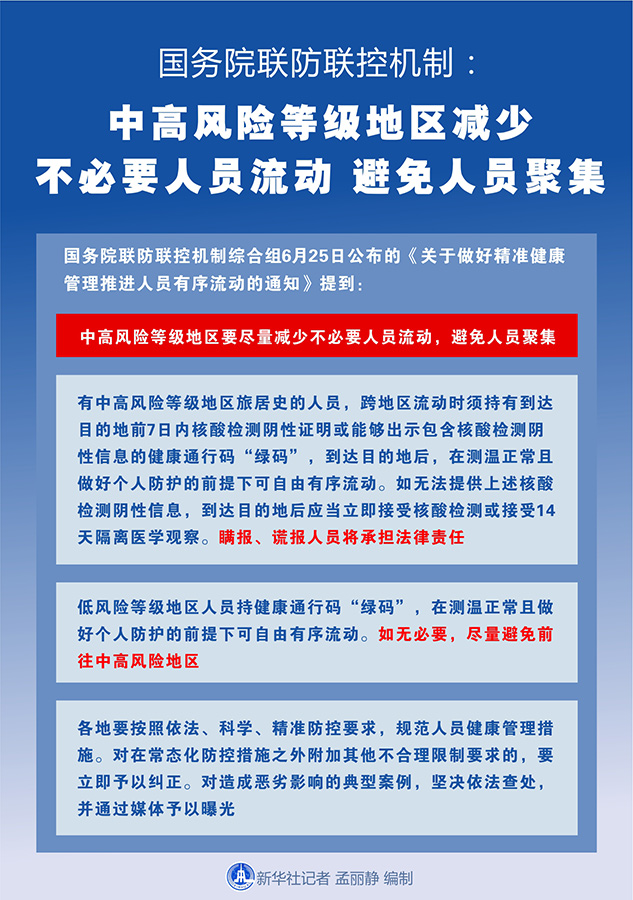 新華社北京6月25日電(記者王秉陽)國務(wù)院聯(lián)防聯(lián)控機制綜合組25日公布的《關(guān)于做好精準健康管理推進人員有序流動的通知》提到,中高風(fēng)險等級地區(qū)要盡量減少不必要人員流動,避免人員聚集。