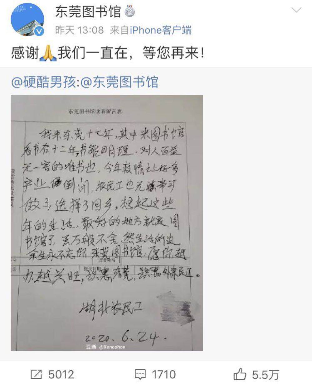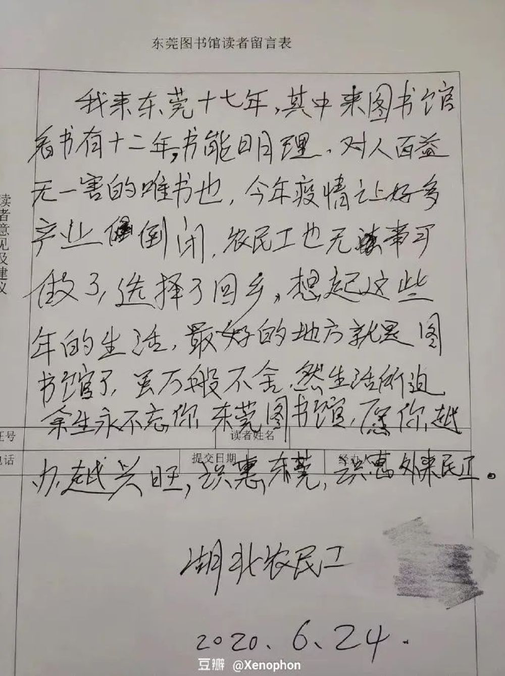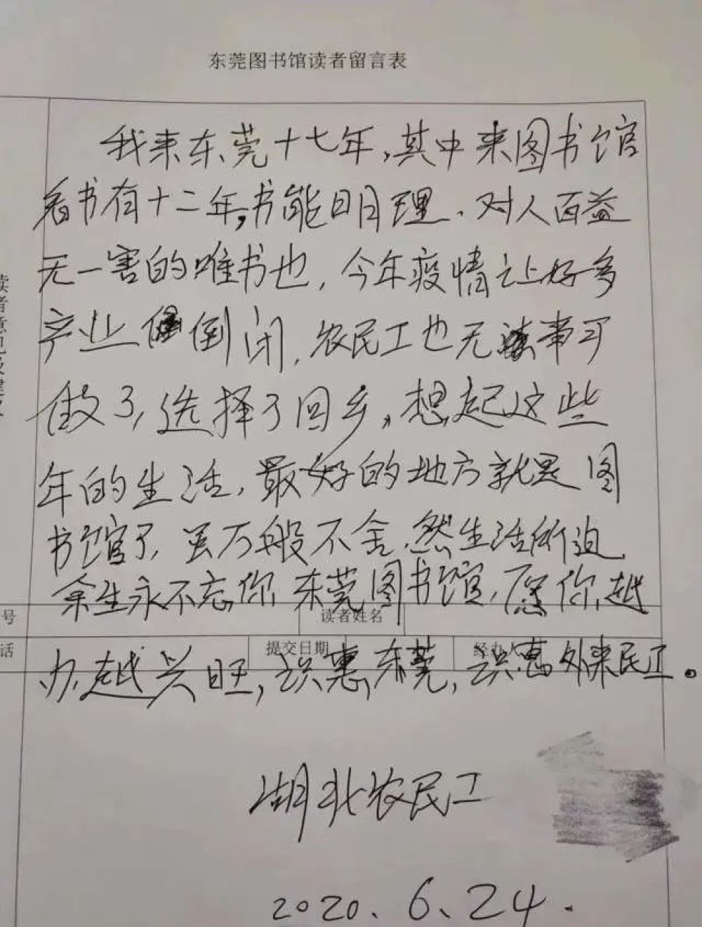 “我來東莞十七年,其中來圖書館看書有十二年。書能明理,對人百益無一害的唯書也。今年疫情讓好多產(chǎn)業(yè)(企業(yè))倒閉,農民工也無事可做了,選擇了回鄉(xiāng)。想起這些年的生活,最好的地方就是圖書館了。雖萬般不舍,然生活所迫,余生永不忘你,東莞圖書館,愿你越辦越興旺。識惠東莞,識惠外來農民工?!?/span>