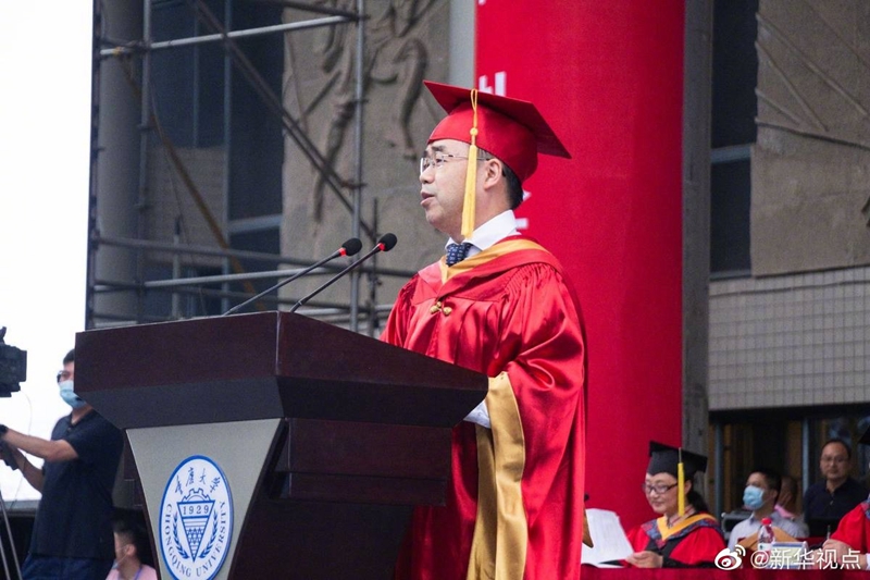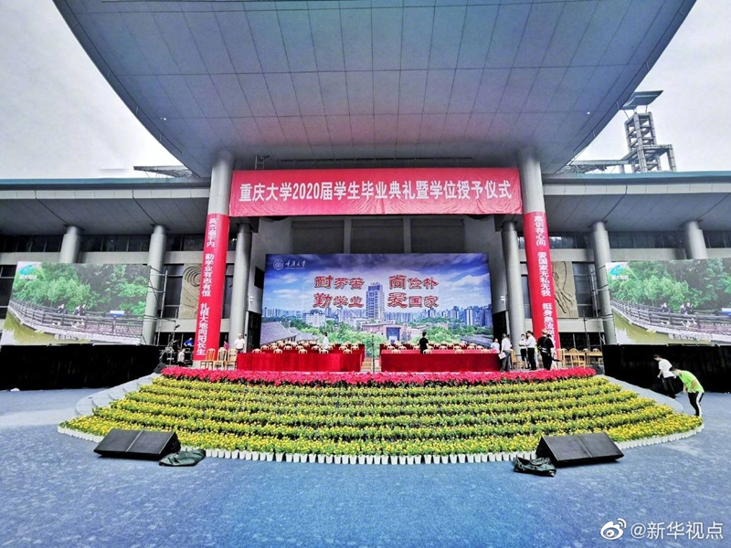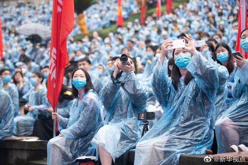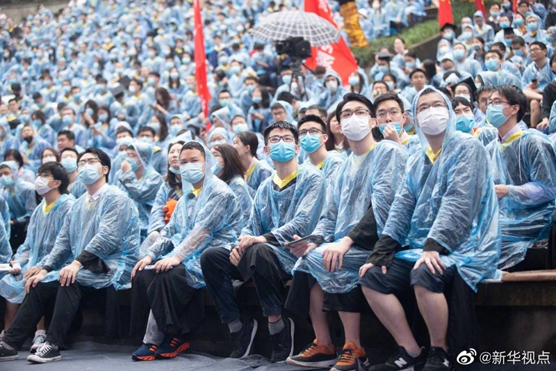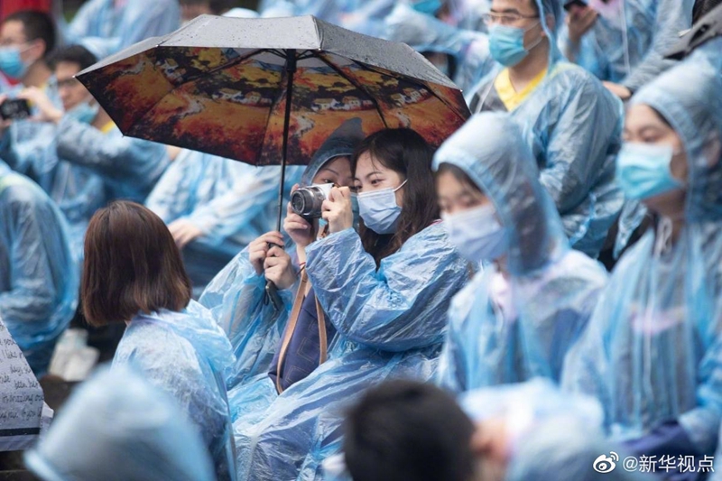 6月28日上午,重慶大學(xué)在風(fēng)雨操場舉行2020屆學(xué)生畢業(yè)典禮上,因為現(xiàn)場突然下起了大雨,校長張宗益在致辭時只念了標(biāo)題,向畢業(yè)生送上深情祝福,還打趣說“好雨知時節(jié)”。參加畢業(yè)典禮的2000余名畢業(yè)生代表穿著雨衣,完成了這場簡短的畢業(yè)典禮。(記者柯高陽)?