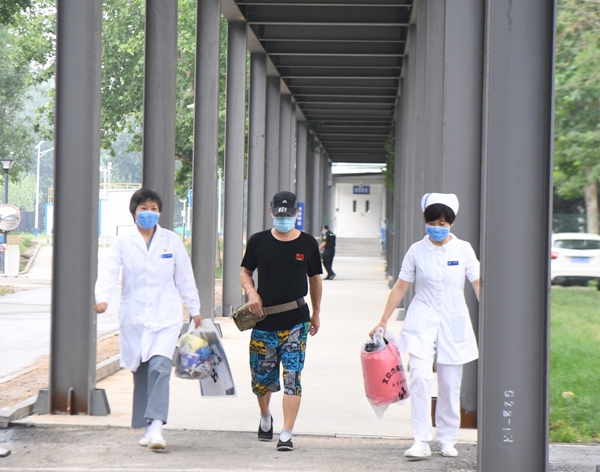 今天出院的老何戴著棒球帽,穿著黑色的短袖衫,綠底兒的沙灘褲,一身輕松。站在地壇醫(yī)院南門廣場(chǎng),老何的口罩戴得嚴(yán)嚴(yán)實(shí)實(shí),他說(shuō)自己在新發(fā)地市場(chǎng)買點(diǎn)牛羊肉,口罩沒(méi)戴嚴(yán)實(shí),“提醒咱們市民一定要做好防控,戴好口罩?!?/p>