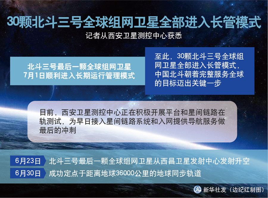新華社西安7月1日電(李國利、徐新芳)記者從西安衛(wèi)星測控中心獲悉,北斗三號最后一顆全球組網(wǎng)衛(wèi)星1日順利進入長期運行管理模式,至此,30顆北斗三號全球組網(wǎng)衛(wèi)星全部進入長管模式,中國北斗朝著完整服務全球的目標邁出關(guān)鍵一步。