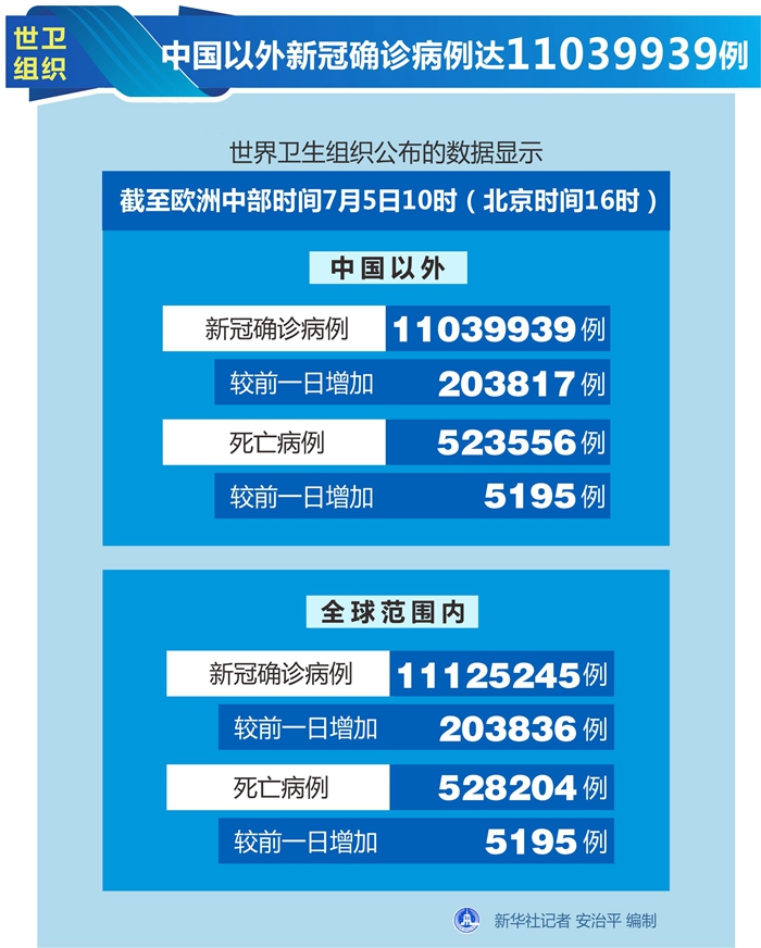 世衛(wèi)組織每日疫情報(bào)告顯示,截至歐洲中部時(shí)間5日10時(shí)(北京時(shí)間16時(shí)),中國(guó)以外新冠確診病例較前一日增加203817例,達(dá)到11039939例;中國(guó)以外死亡病例較前一日增加5195例,達(dá)到523556例。