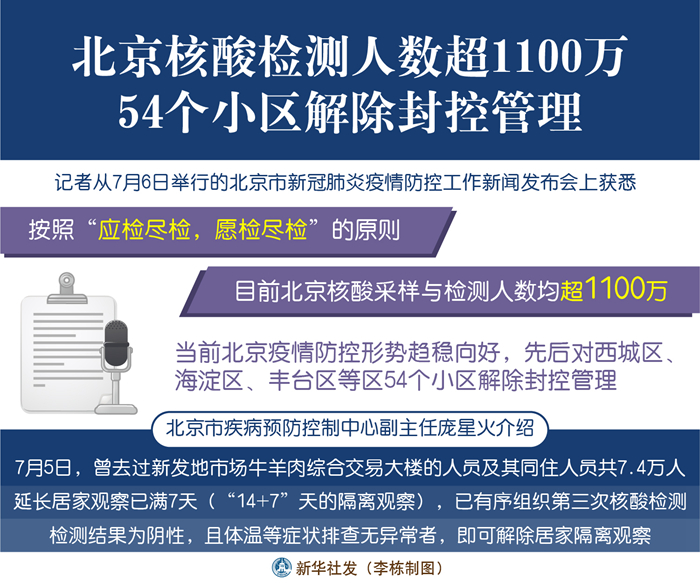 新華社北京7月6日電(記者關桂峰、田晨旭)記者從6日舉行的北京市新冠肺炎疫情防控工作新聞發(fā)布會上獲悉,按照“應檢盡檢,愿檢盡檢”的原則,目前北京核酸采樣與檢測人數均超1100萬。當前北京疫情防控形勢趨穩(wěn)向好,先后對西城區(qū)、海淀區(qū)、豐臺區(qū)等區(qū)54個小區(qū)解除封控管理。