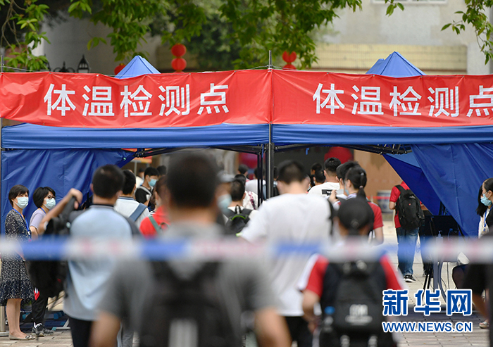 7月7日,在福州第二中學(xué)考點,考生進入考場前有序通過體溫檢測點。 當(dāng)日,2020年高考拉開帷幕。 新華社記者 魏培全 攝
