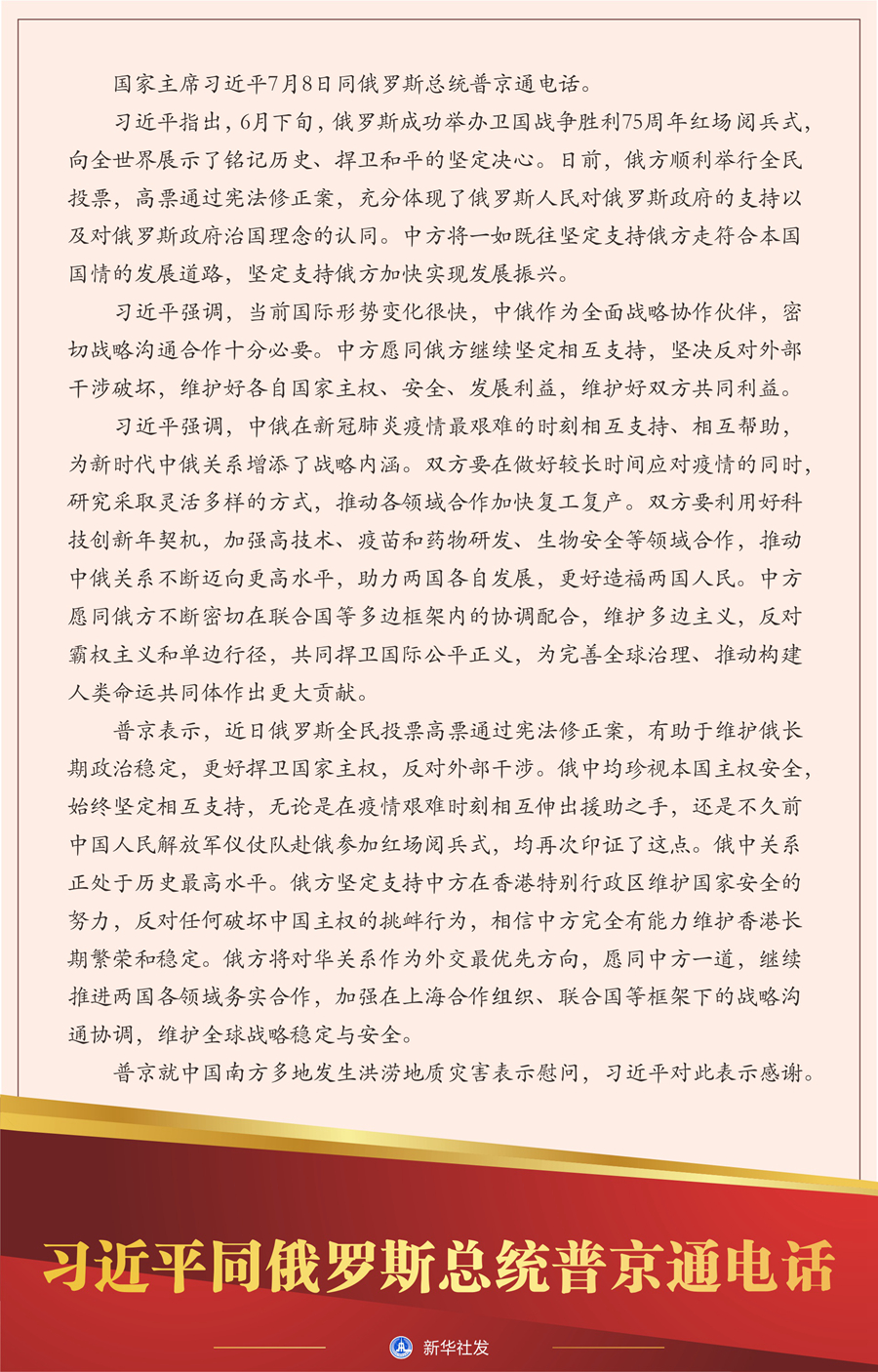 習(xí)近平指出,6月下旬,俄羅斯成功舉辦衛(wèi)國(guó)戰(zhàn)爭(zhēng)勝利75周年紅場(chǎng)閱兵式,向全世界展示了銘記歷史、捍衛(wèi)和平的堅(jiān)定決心。日前,俄方順利舉行全民投票,高票通過(guò)憲法修正案,充分體現(xiàn)了俄羅斯人民對(duì)俄羅斯政府的支持以及對(duì)俄羅斯政府治國(guó)理念的認(rèn)同。中方將一如既往堅(jiān)定支持俄方走符合本國(guó)國(guó)情的發(fā)展道路,堅(jiān)定支持俄方加快實(shí)現(xiàn)發(fā)展振興。